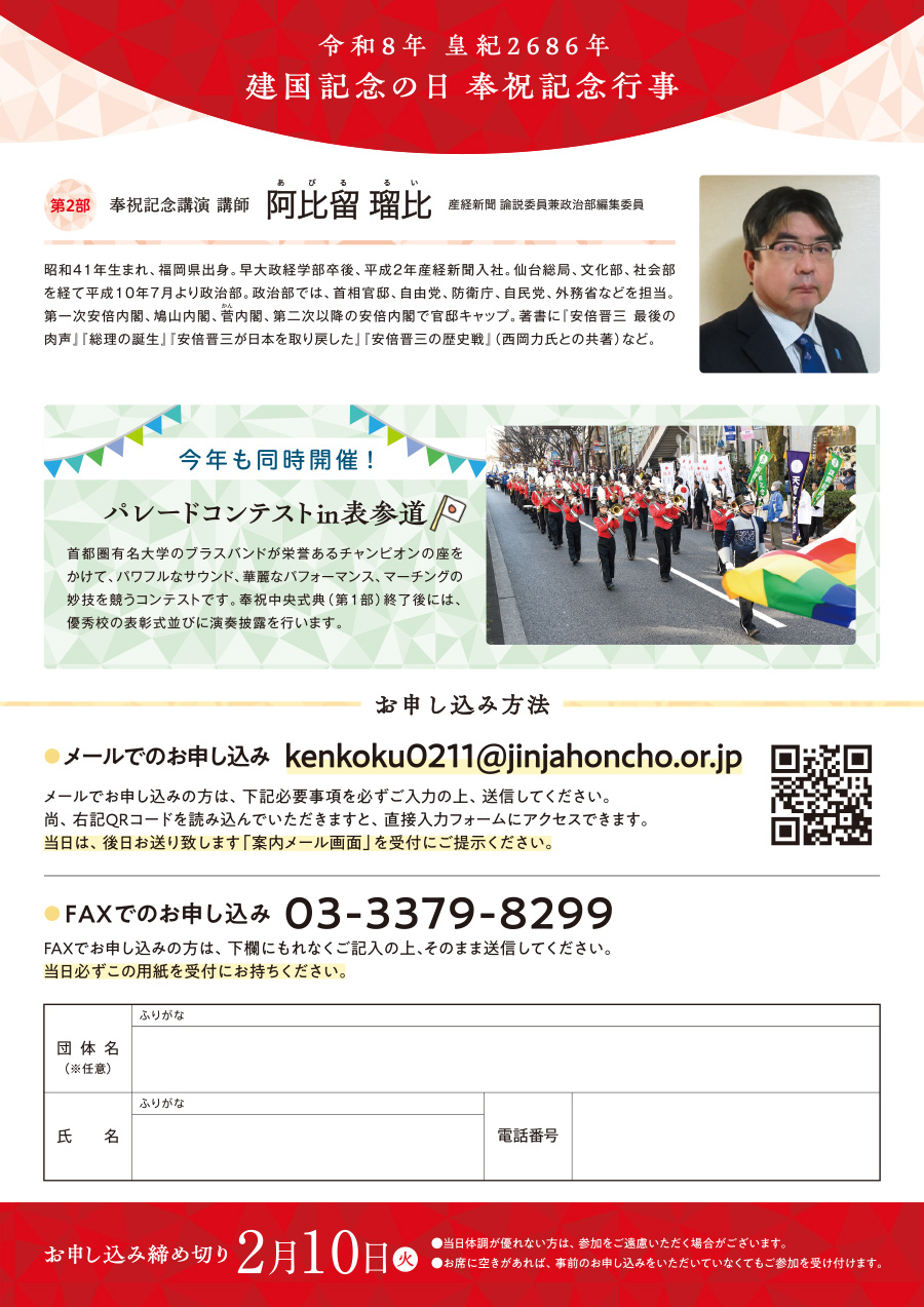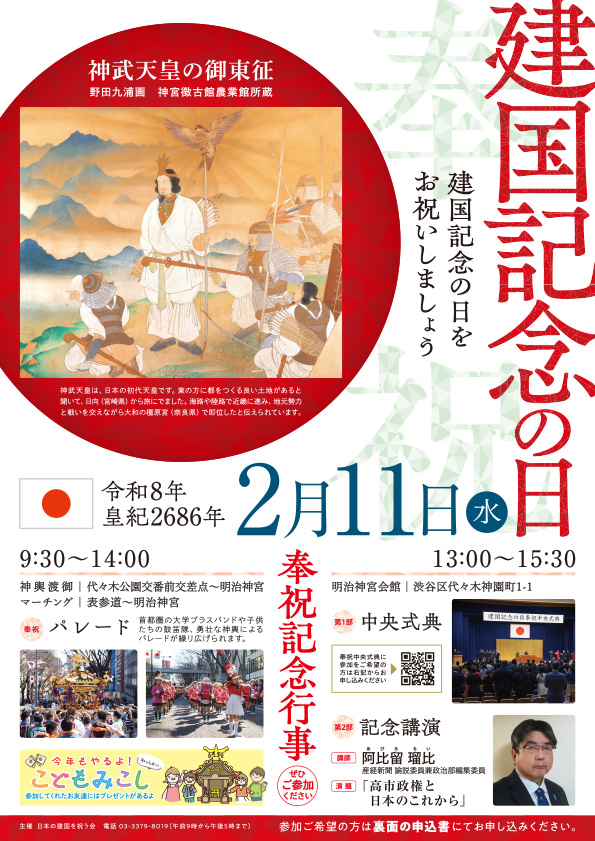 2月11日(水・祝)、建国記念の日を祝う奉祝記念行事が開催されます。