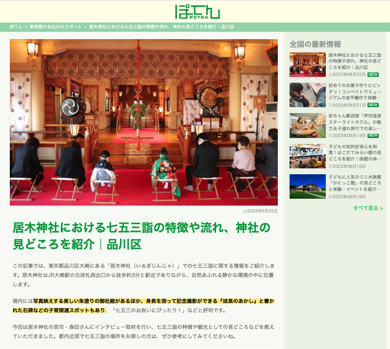 この度、情報発信サイト「ぽてん」にて居木神社の七五三と居木神社の観光の見どころなどが紹介されました。