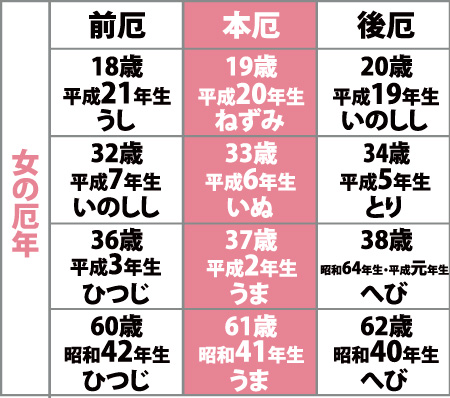 下記の生まれ年の方は、お祓いを受けて無事平穏を祈願しましょう。